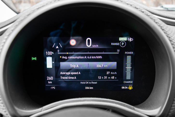 A járművel egyszerre megtehető kilométerek száma mindig attól függ, milyenek a körülmények. 100 km-t ugyanis megtehetünk úgy is, hogy közel 30 kWh lesz a fogyasztásunk, de úgy is, hogy csak 15 kWh. Nyilván télen, amikor odakint minusz 5 fok van, a kocsiban megy a fűtés, ülésfűtés, és Normal módban autózunk, közelebb lesz inkább a 30 kWh-hoz ez az érték. Viszont nyáron, városban, Range üzemmódban általában 50 km/h-s átlagsebességgel, fűtés és ülésfűtés nélkül ez az érték 15 kWh alá szorítható.