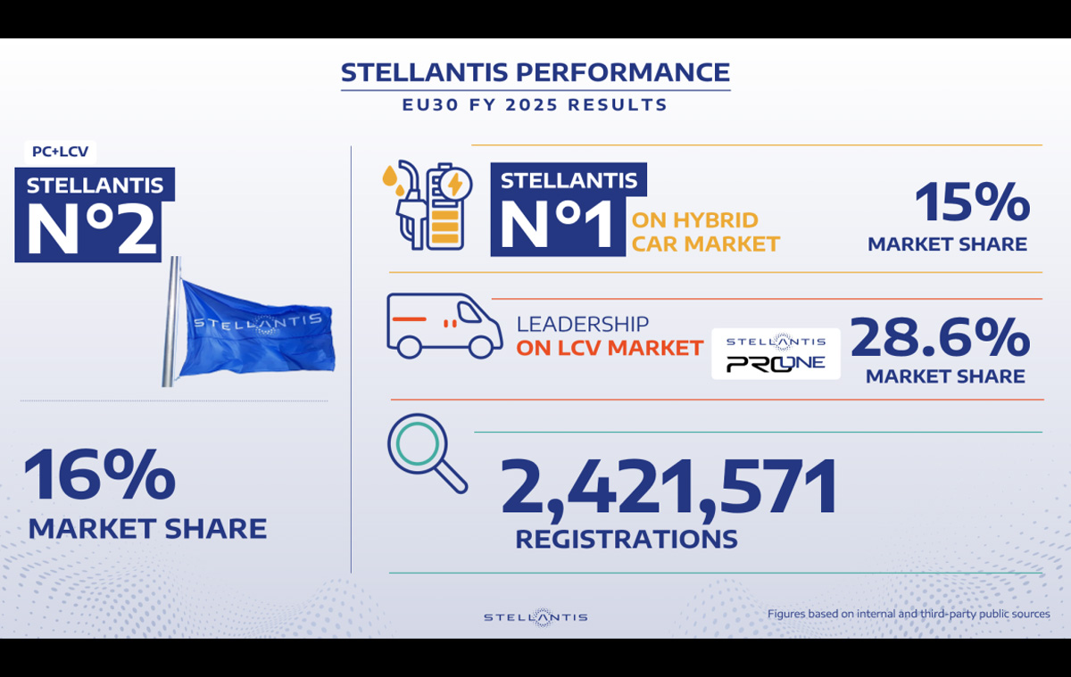 Több mint 2,4 millió regisztrációval és 16%-os piaci részesedéssel a Stellantis a 2025-ös évet az EU30 autóipari piacának második legnagyobb OEM-jeként zárta